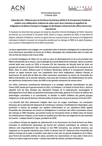 Le Contrat Stratégique de Filière est un outil au coeur du développement et de la structuration des filières industrielles de la France, sous le pilotage du Conseil National de l’Industrie. Après un premier contrat lancé avec succès en 2020, le nouveau CSF des Industries de Sécurité vient de créer ses groupes de travail le 10 janvier 2024 et prévoit ainsi plusieurs actions au profit de la croissance de la filière. Dans ce cadre, l’Alliance pour la Confiance Numérique (ACN) et le Groupement Hexatrust lancent un appel commun pour une coopération forte entre intégrateurs, éditeurs français et fournisseurs de cloud afin de bâtir des offres communes souveraines au service de l’ensemble des filières industrielles, de la sécurité nationale, mais aussi des territoires, des établissements de santé, des opérateurs d’importance vitale, des PME et des grandes entreprises du secteur privé.